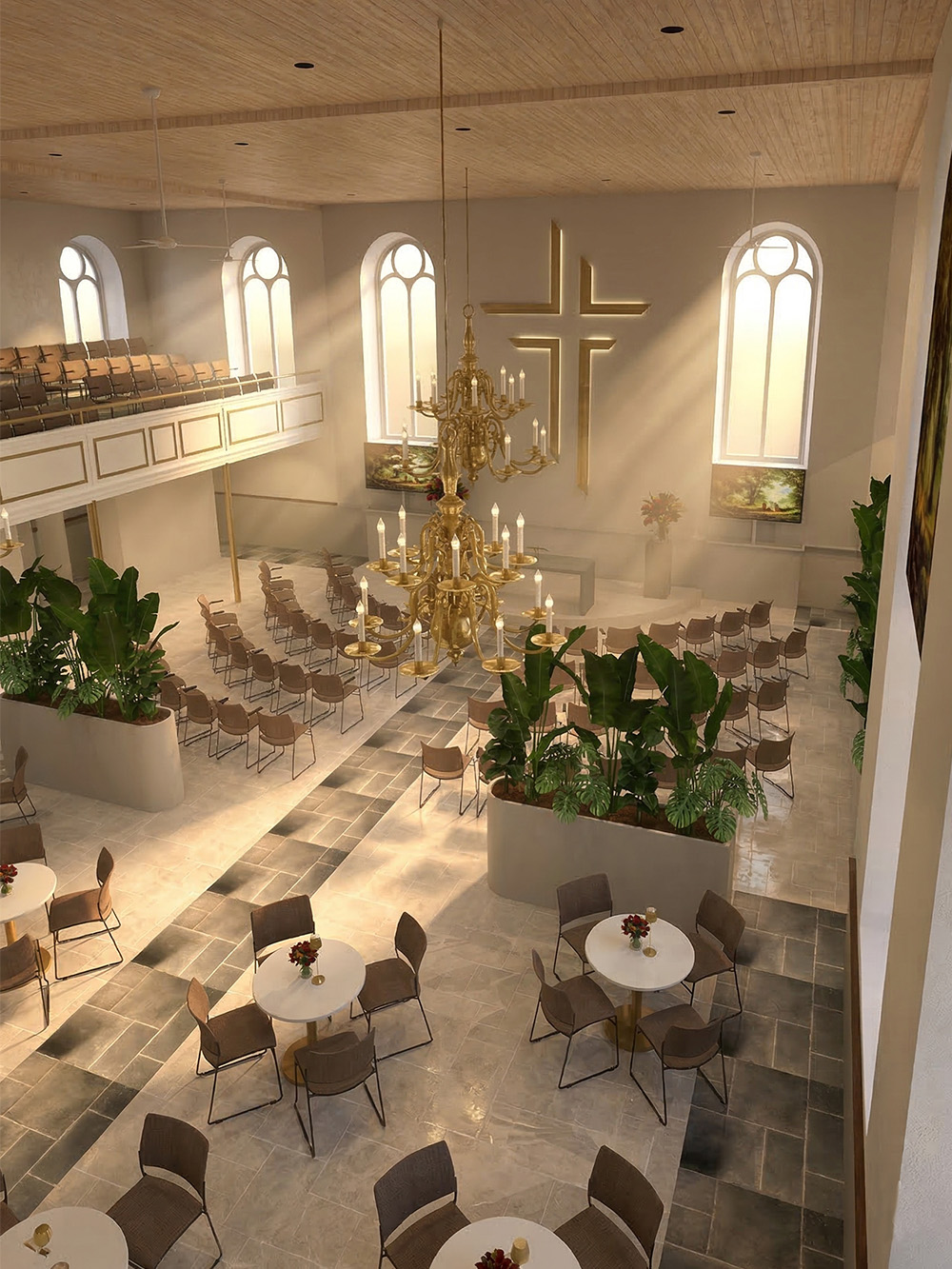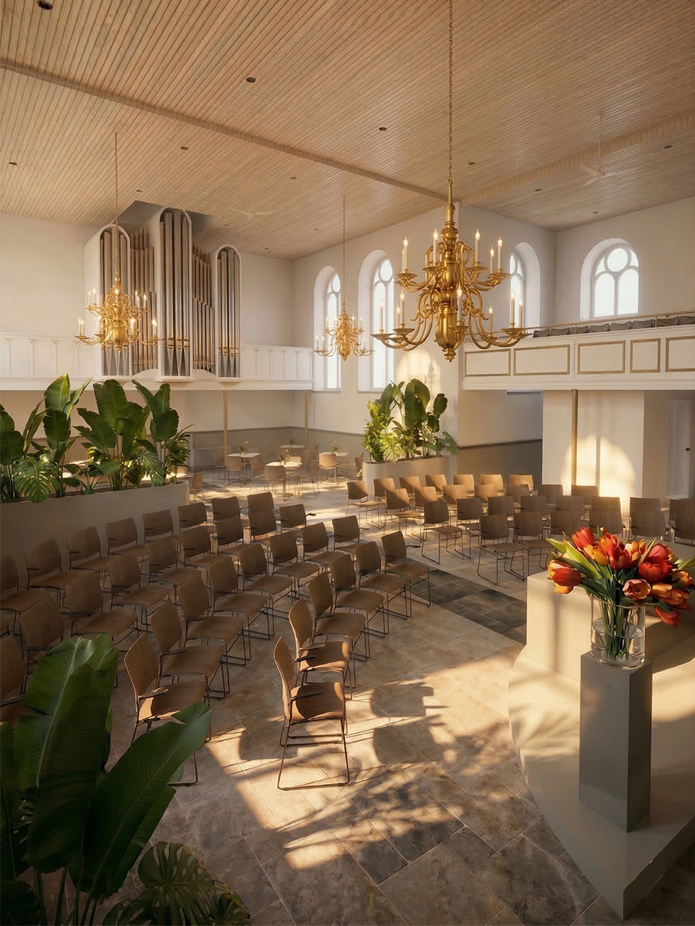Een groot kerkinterieur kan snel open en leeg aanvoelen. In dit project is daarom gekozen voor verrijdbare plantenbakken die de ruimte op een subtiele manier structureren. Planten werken hier als zachte ruimteverdelers. Ze markeren de randen van het zitgedeelte, brengen schaal terug in het interieur en voegen tegelijkertijd leven en warmte toe. Omdat de bakken verplaatsbaar zijn blijft de indeling flexibel en kan de ruimte eenvoudig worden aangepast voor een andere opstelling of activiteit.